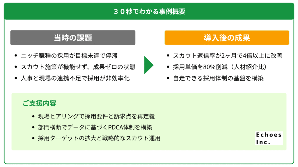 エコーズは、この課題を解決するため、単なるスカウトの「代行」ではなく、採用活動全体の「再構築」から着手しました。