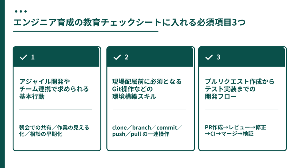 エンジニア育成の教育チェックシートに入れる必須項目3つ