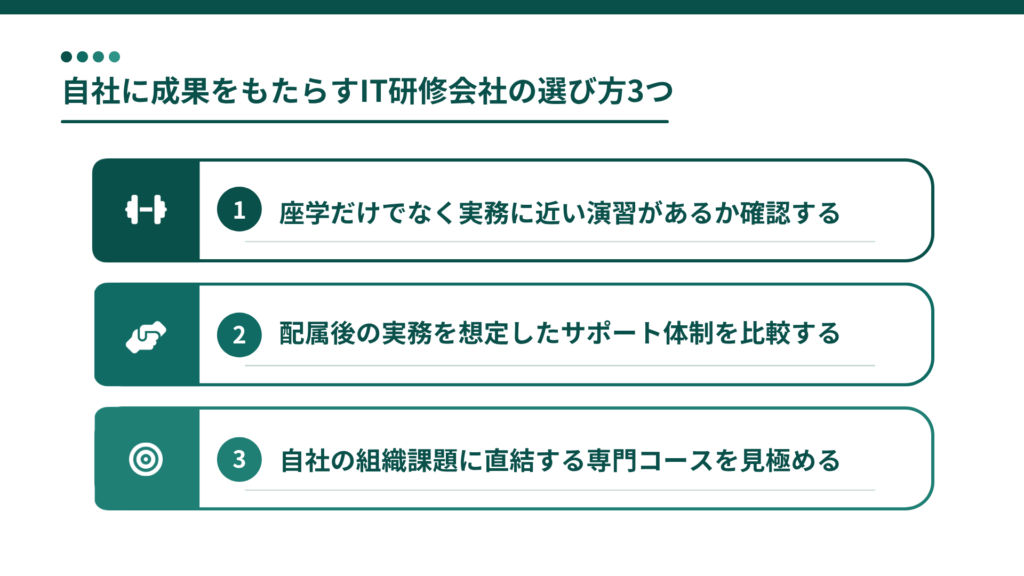 IT研修会社は、実務に近い演習・配属後の支援・自社課題に合うコース設計の3点で選びましょう。