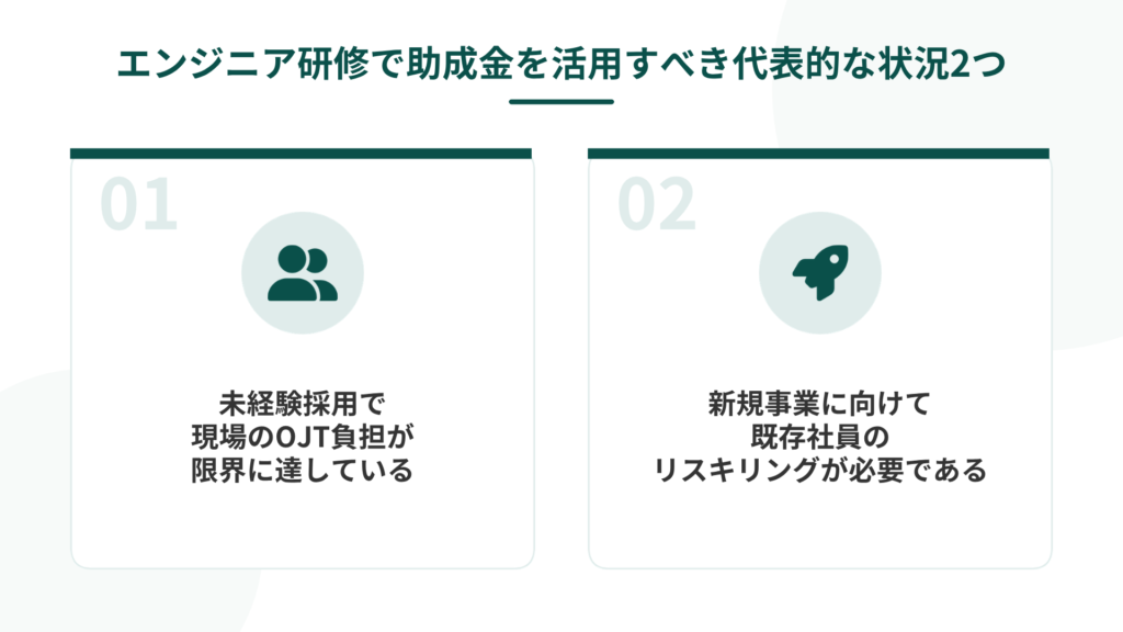 ここでは、エンジニア研修で助成金を活用する企業に多く見られる代表的な状況を紹介します。