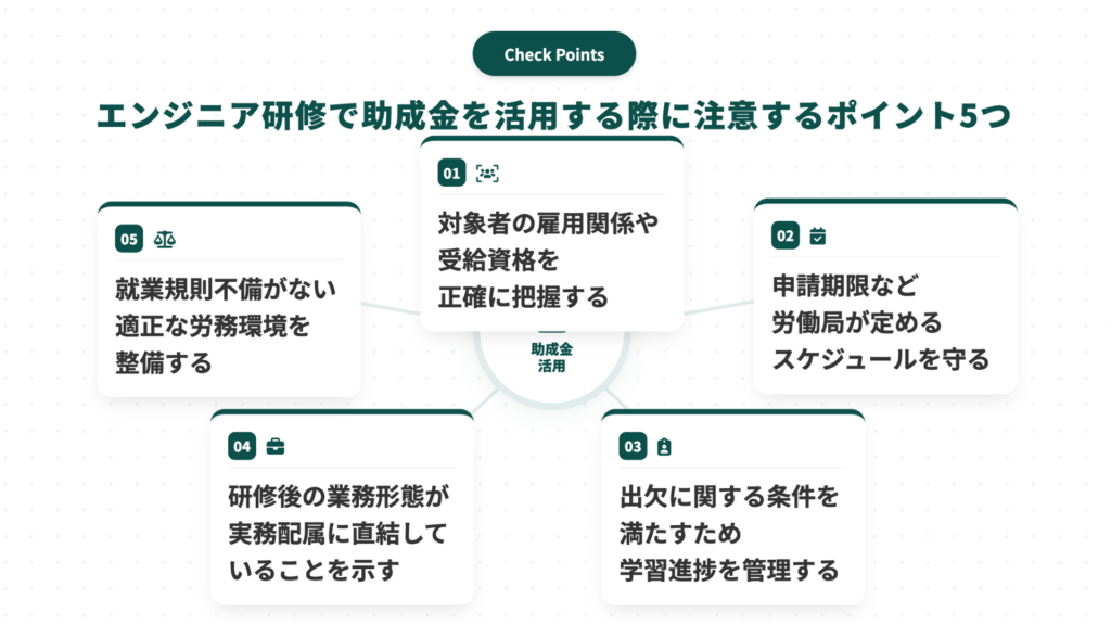 ここでは、エンジニア研修で助成金を活用する際に確認しておきたい主な注意点を紹介します。