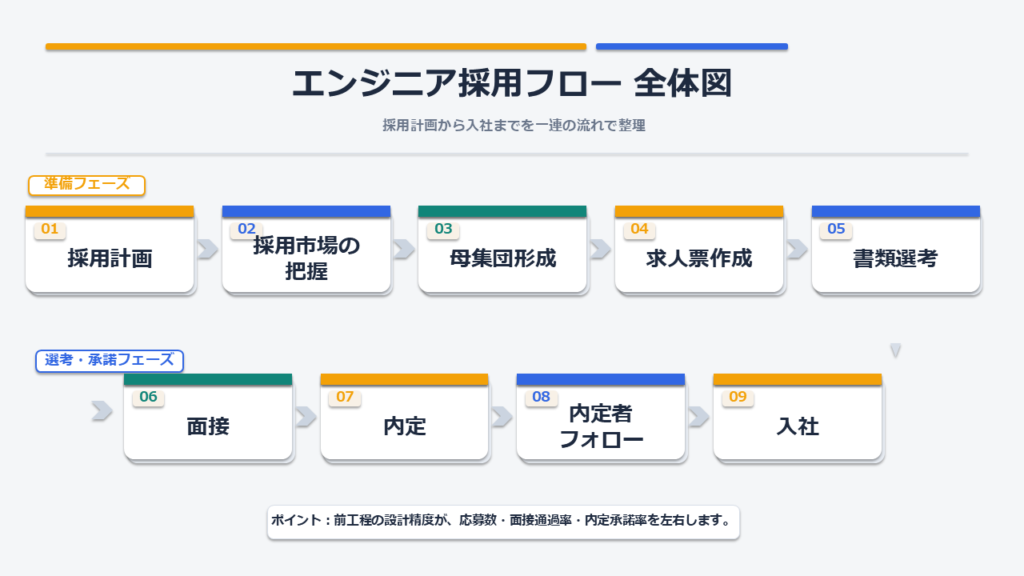 本記事では、エンジニア採用フローの全体像を整理したうえで、採用計画、要件定義、面接設計、内定者フォローまでの進め方を解説します。