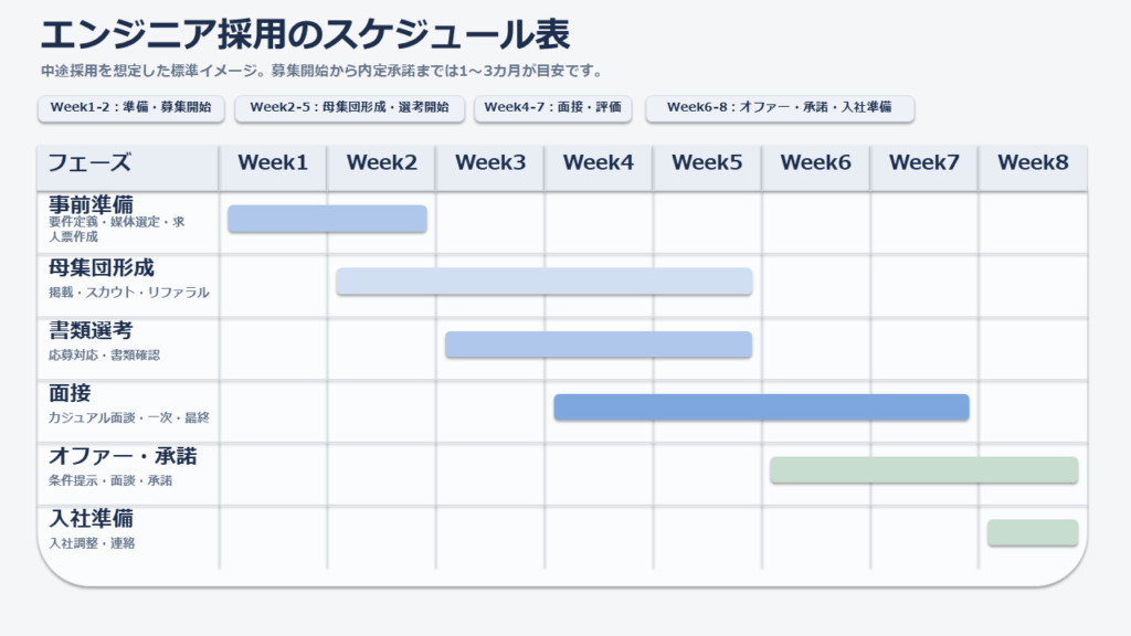 中途採用では、以下のとおり募集から内定承諾まで1〜3カ月を見込む設計が現実的です。